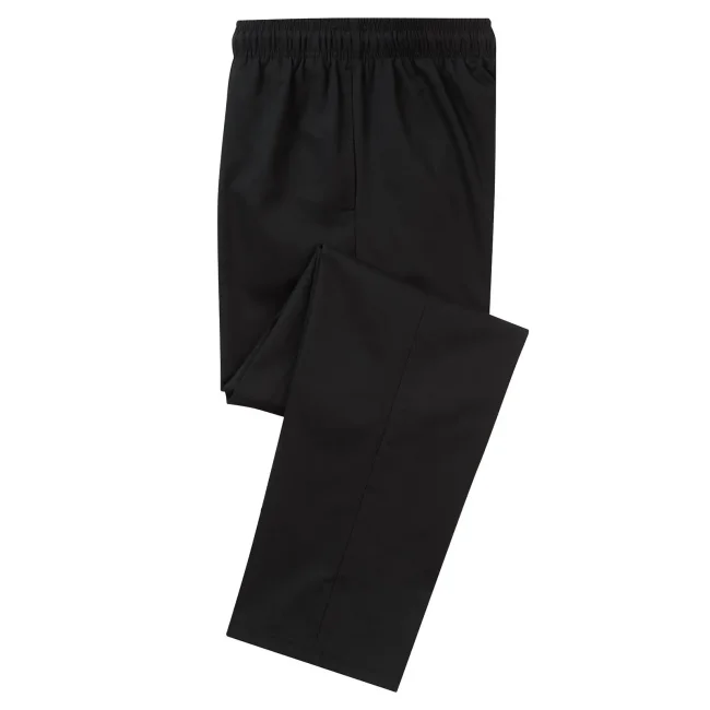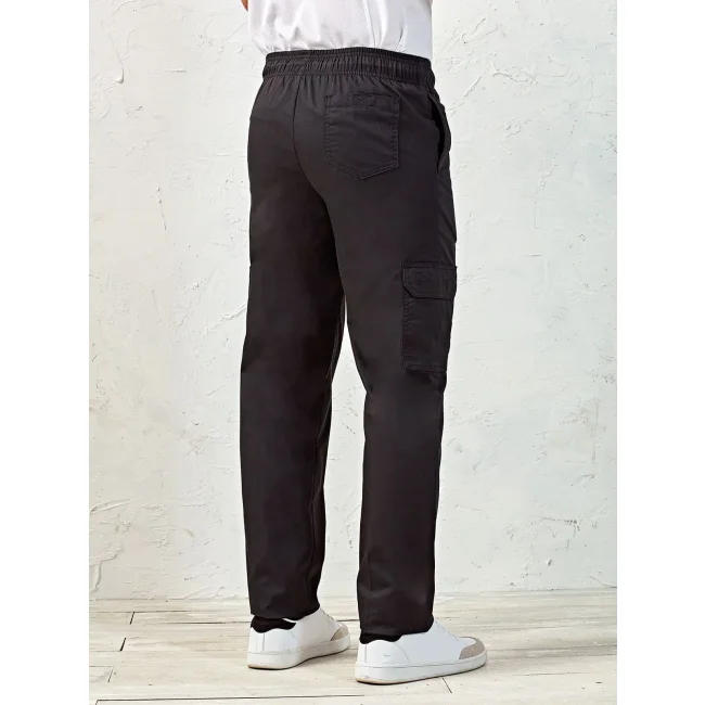 65% poliestere, 35% cotone Twill. Pantaloni da cuoco con girovita elastico e regolazione con coulisse. Tasca posteriore singola con chiusura a strappo, due tasche per il telefono.