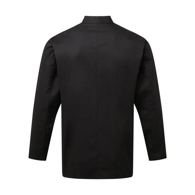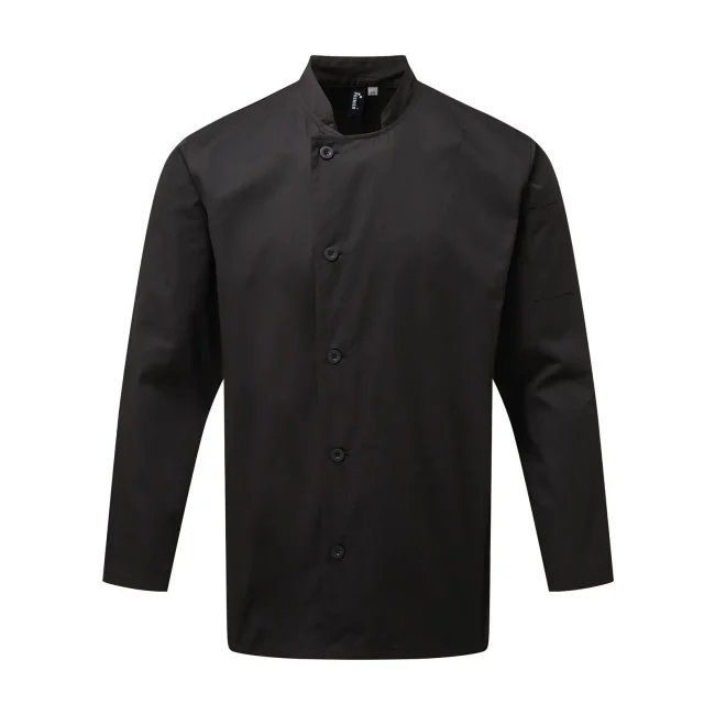 65% poliestere, 35% cotone twill. Giacca da chef resistente a maniche lunghe, chiusura con 5 bottoni, bottoni in resina di lunga durata, tasca doppia per penne, colletto alla coreana.