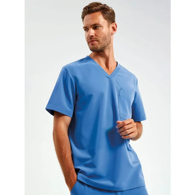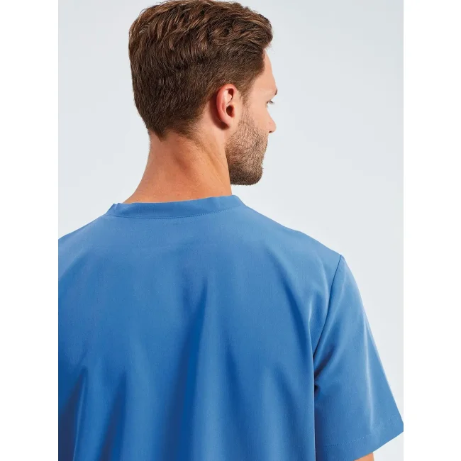 tutto il giorno, tessuto resistente, ingualcibile e easy care, taglio moderno con riprese posteriori e spacchetti laterali, scollo a V e taschino sul petto a sinistra.