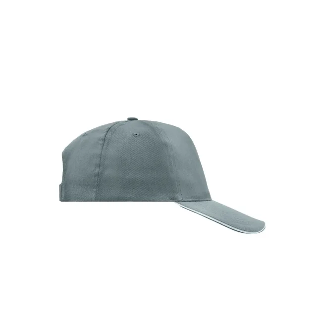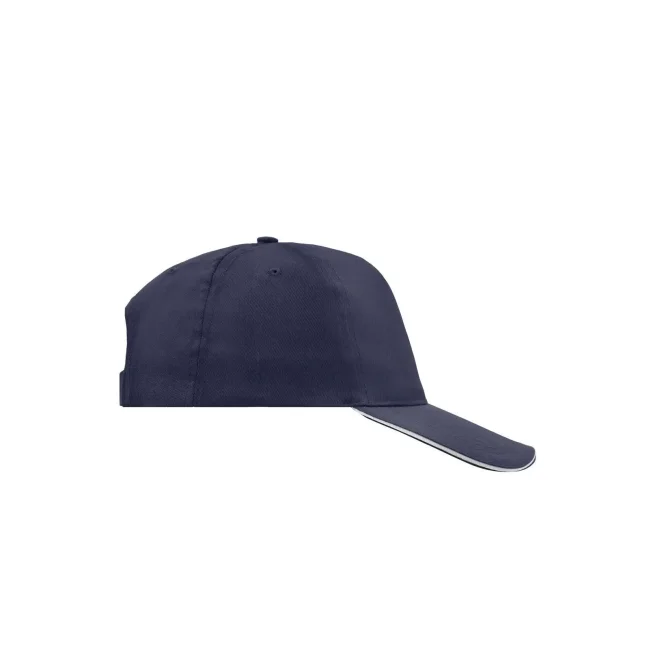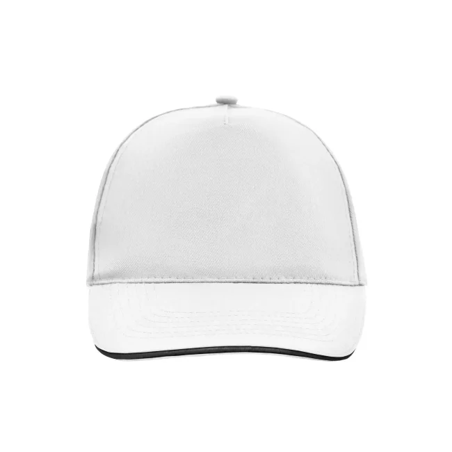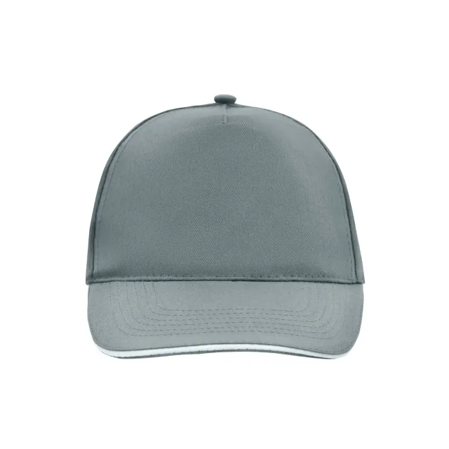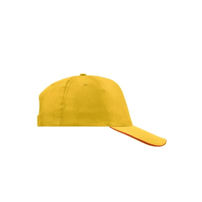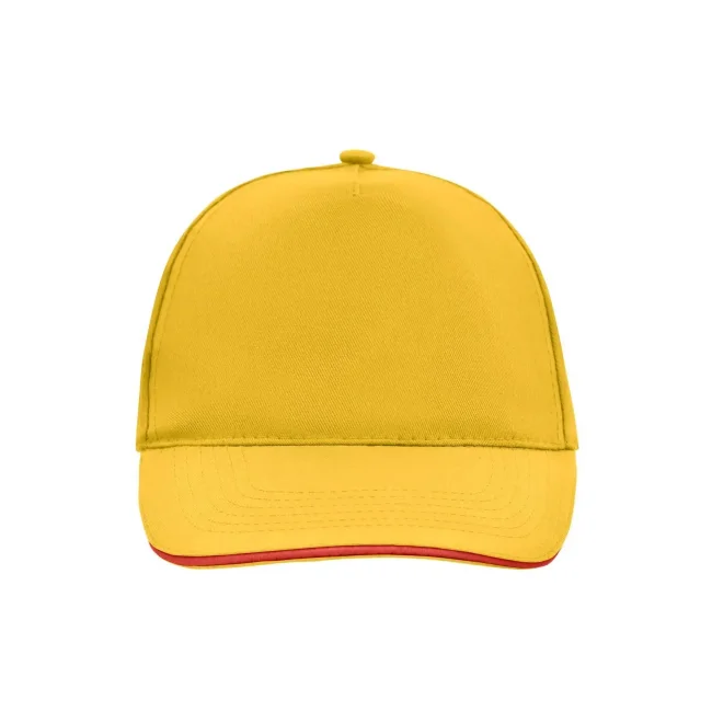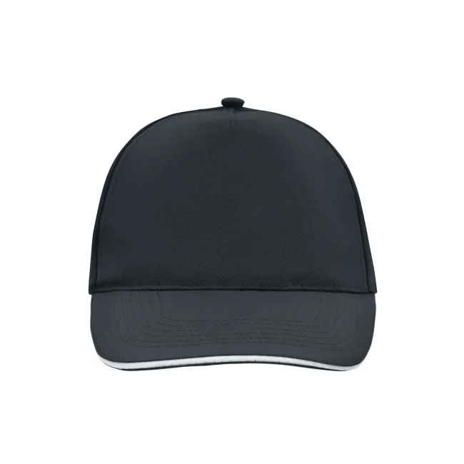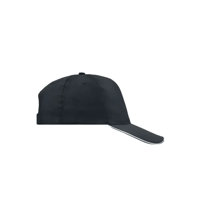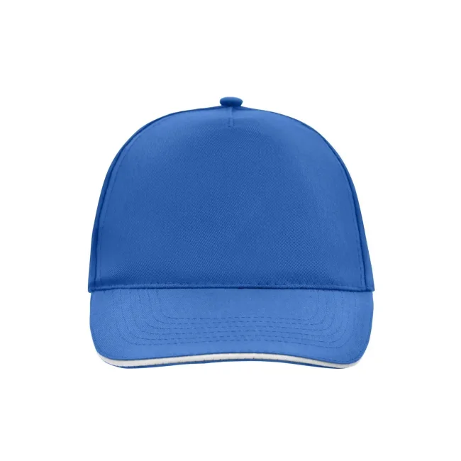 100% cotone. Promo Cap a 5 pannelli con sandwich a contrasto Pannelli frontali leggermente laminati, 4 fori di aerazione imbastiti, 6 cuciture sulla visiera, Chiusura in velcro, Fascetta tergisudore in cotone, Velcro, policromo, Sandwich.