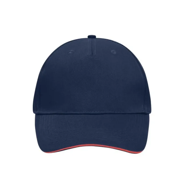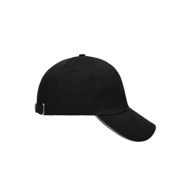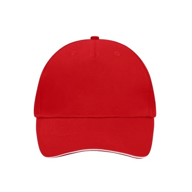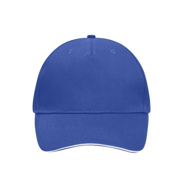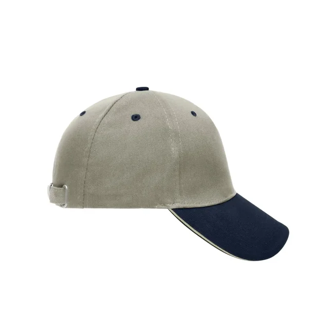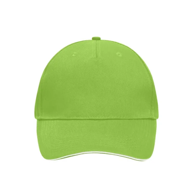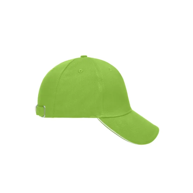 100% cotone. Sandwich Cap in molti colori 6 fori per ventilazione imbastiti, 6 cuciture sulla visiera , Pannello frontale laminato, Fascetta tergisudore in cotone imbottito, Chiusura a clip in argento opaco con asola di metallo. Policromo, Sandwich.