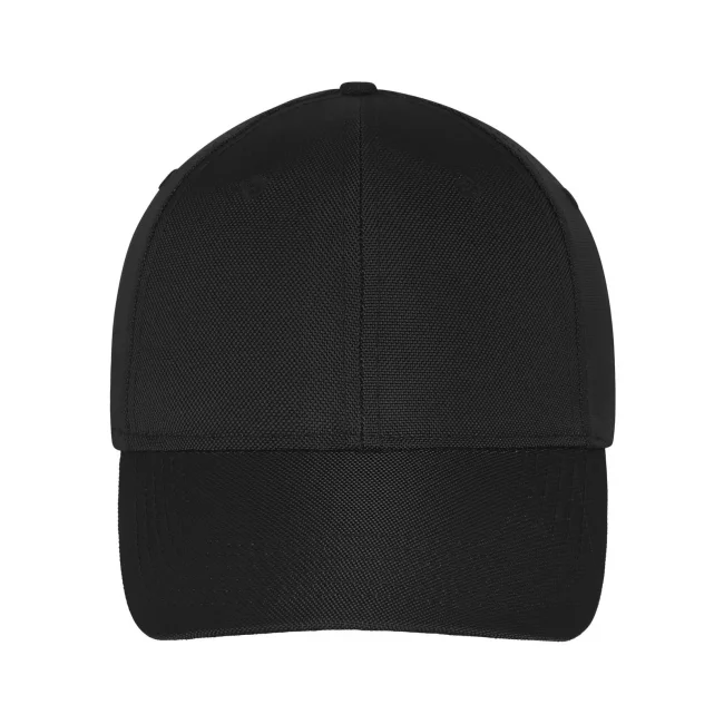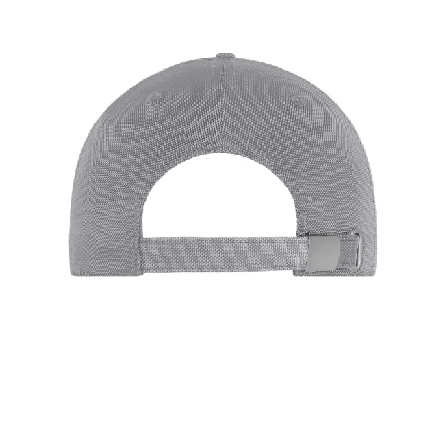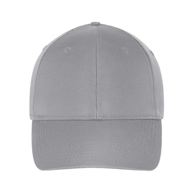 100% poliestere. Cappellino con 6 pannelli frontali laminati, 6 fori per l'aria ricamati, 6 cuciture decorative sulla visiera, fascia antisudore foderata, chiusura a clip in argento opaco con occhiello in metallo.