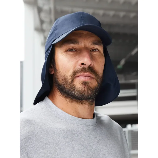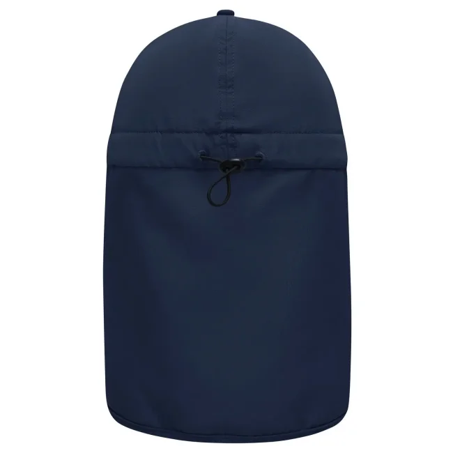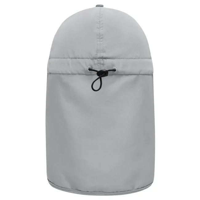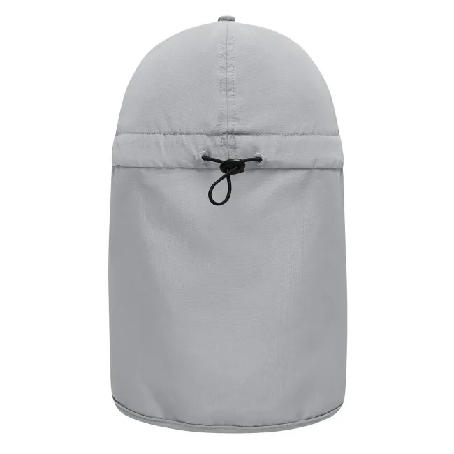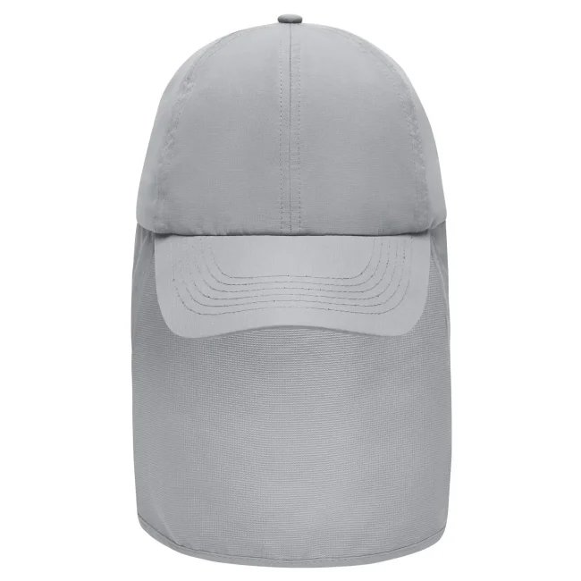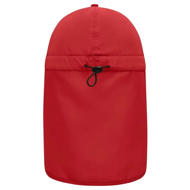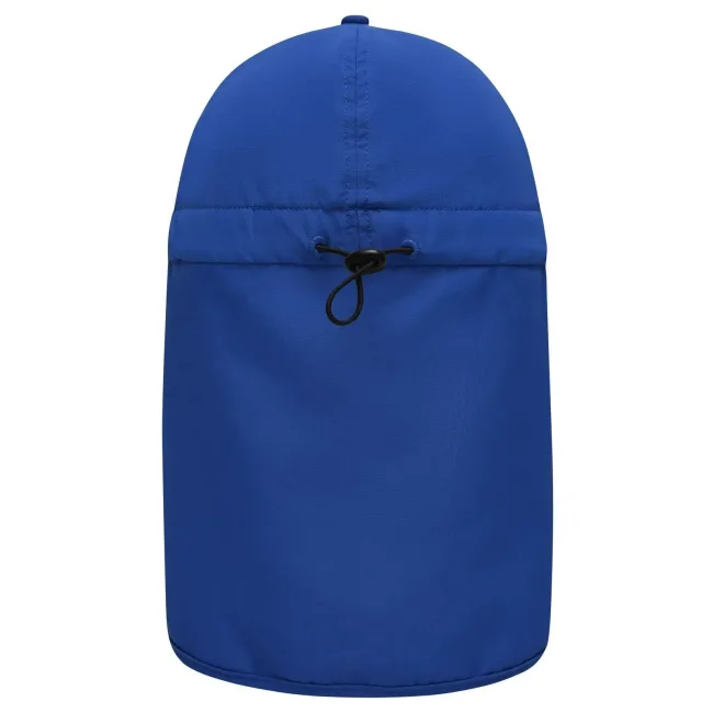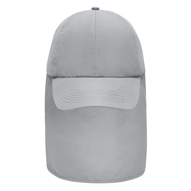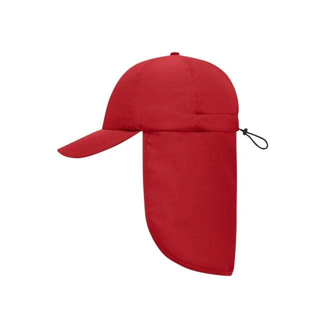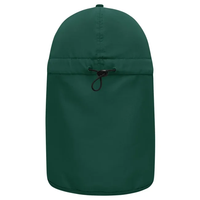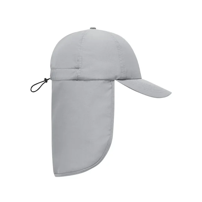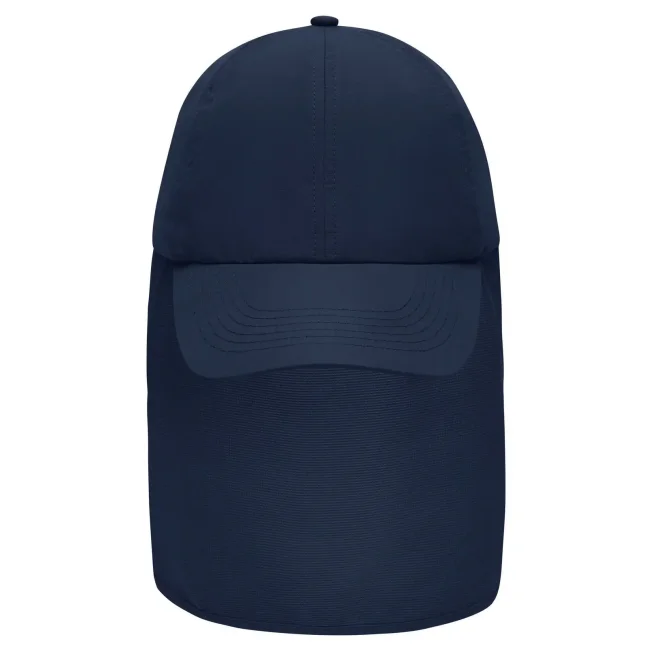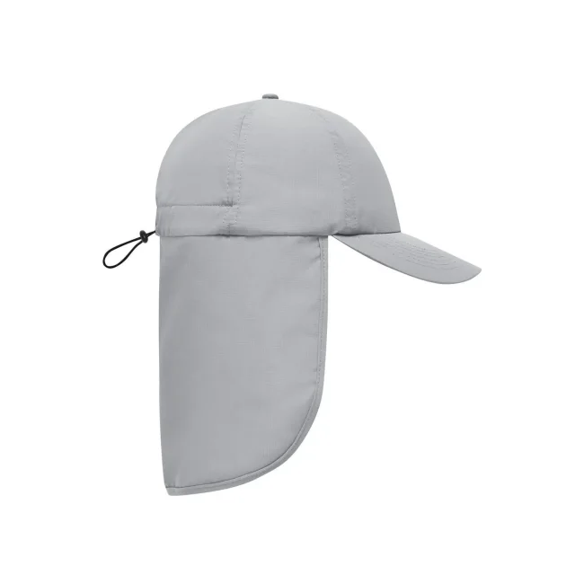 100% poliestere. Cappellino a 6 pannelli con protezione per il collo e protezione dai raggi UV, tessuto robusto, 6 cuciture decorative sulla visiera, parasudore imbottito per un maggiore comfort, regolabile tramite cordino elastico. taglia unica: 55-60 cm. Protezione UV 50+.