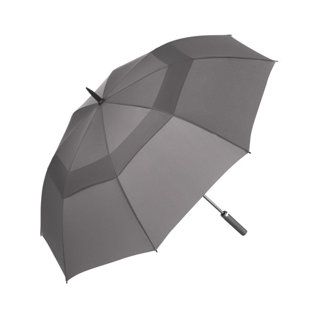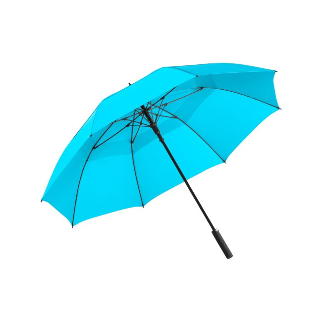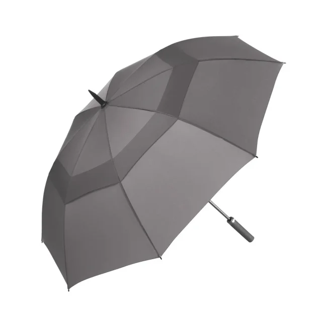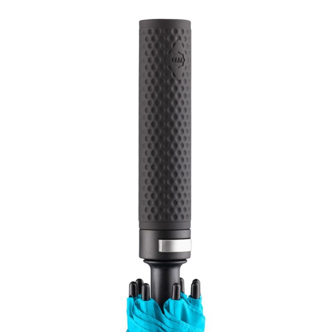 Sistema di ventilazione sovrapposto per la regolazione della pressione generata dalle forti raffiche di vento, pregiato sistema Windproof per una flessibilità del telaio massima anche in caso di raffiche di vento forti, confortevole funzione automatica per un'apertura rapida, bastone in fibra di vetro stabile, stecche in fibra di vetro flessibili, esclusiva impugnatura soft-touch con tasto di azionamento argentato e possibilità di applicazione della pubblicità, fodera con due nastri di chiusura per un bloccaggio ottimale in stato chiuso, comoda custodia a tracolla, diametro confortevole anche per accompagnatore. Diametro: 133 cm, lunghezza da chiuso: 102 cm, 8 pannelli.