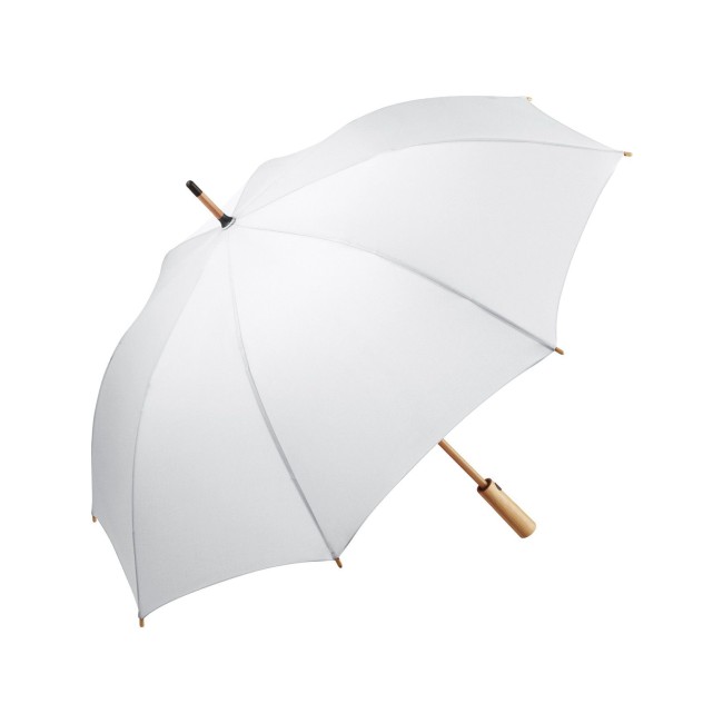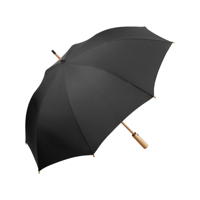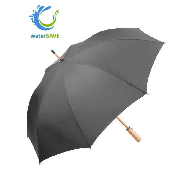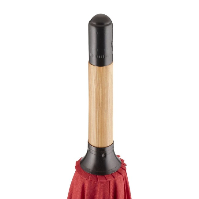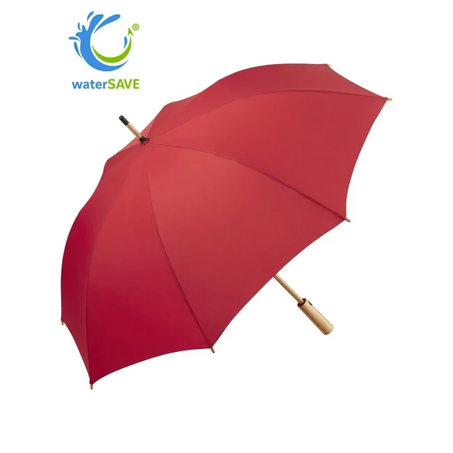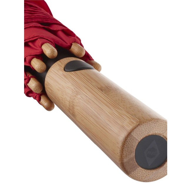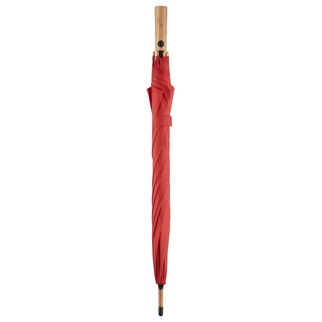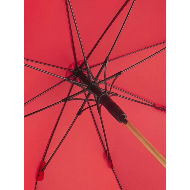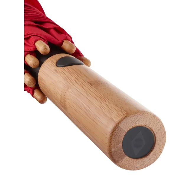 Copertura: 100% poliestere pongee, manico: bambù, asta: bambù. Ombrello con meccanismo automatico di apertura, sistema windproof, stecche flessibili in fibra di vetro, fodera in plastica riciclata WaterSAVE certificata OEKO-TEX, punte e impugnatura in bambù con pulsante nero e possibilità di personalizzazione. Diametro: 112 cm, lunghezza da chiuso: 88 cm, 8 pannelli.
