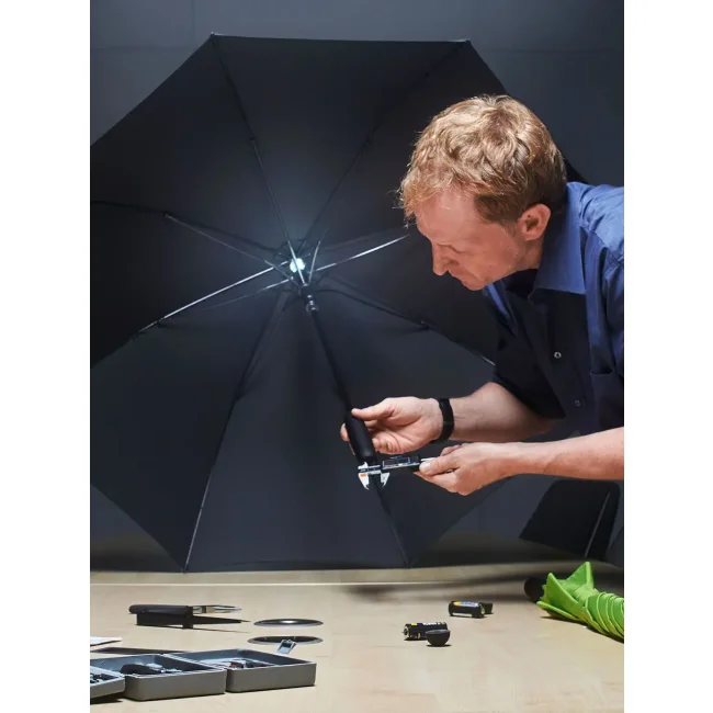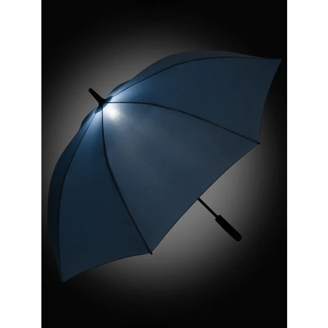 Copertura: 100% poliestere pongee, manico: plastica, asta: acciaio. Ombrello-bastone ad apertura automatica con luce interna a LED, sistema Windproof, stecche flessibili in fibra di vetro, manico soft feel personalizzabile, protezione dalla corrosione grazie alla galvanizzazione nera del bastone in acciaio, Diametro: 111 cm, lunghezza da chiuso: 85 cm, 8 pannelli.
