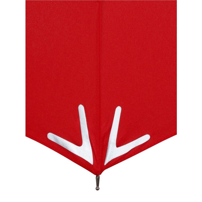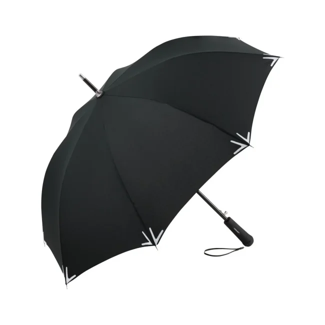 100% poliestere. Fodera con materiale 3M™ Scotchlite™ Reflective agli angoli degli spicchi e impugnatura con LED orientabile per una visibilità ottimale nel traffico, luce di testa regolabile (luce bianca continua oppure luce rossa lampeggiante), confortevole funzione automatica per un'apertura rapida, stecche in fibra di vetro flessibili, proprietà Windproof per una maggiore flessibilità del telaio e migliore resistenza contro il vento, impugnatura soft-touch con tasto di azionamento piatto e possibilità di applicazione della pubblicità, elevata protezione contro la corrosione grazie alla galvanizzazione nera del bastone in acciaio. Diametro: 105 cm, lunghezza da chiuso: 83 cm, 8 pannelli.