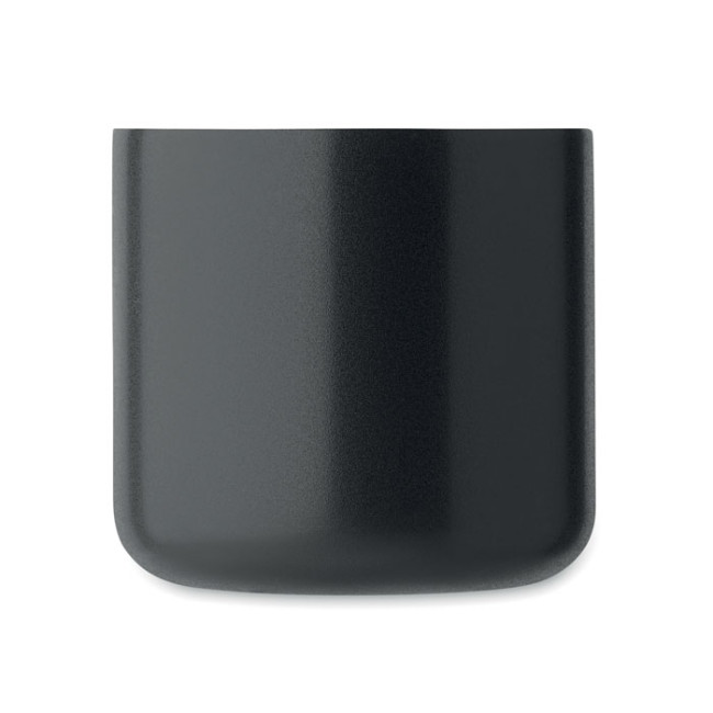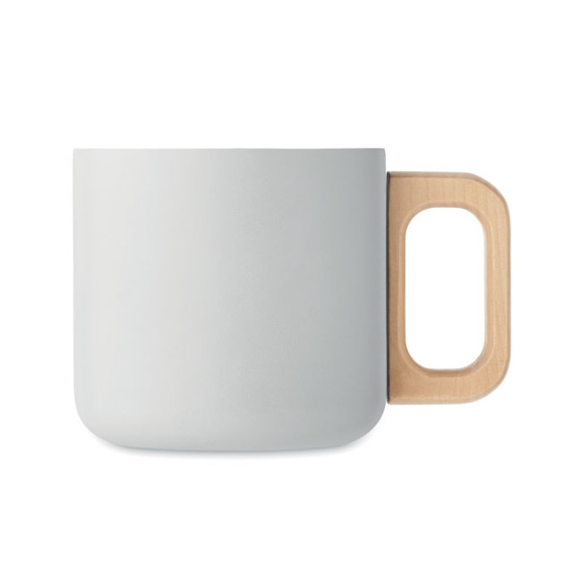 Tazza doppio strato in acciaio inox riciclato (90% acciaio inox riciclato e 10% acciaio inox) con manico in legno. Capacità: 350 ml.