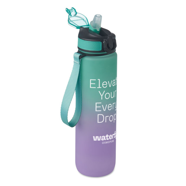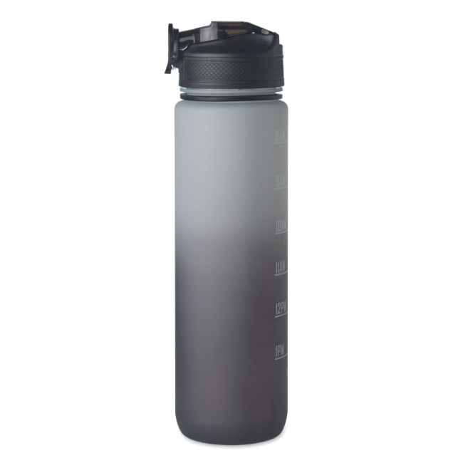 Borraccia sportiva in RPET con cannuccia integrata, boccaglio in morbido silicone, indicazione del tempo motivazionale, coperchio flip top apribile con una sola mano, chiusura di sicurezza e cinghia di trasporto. Capacità 1L.