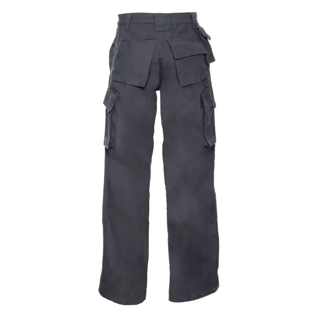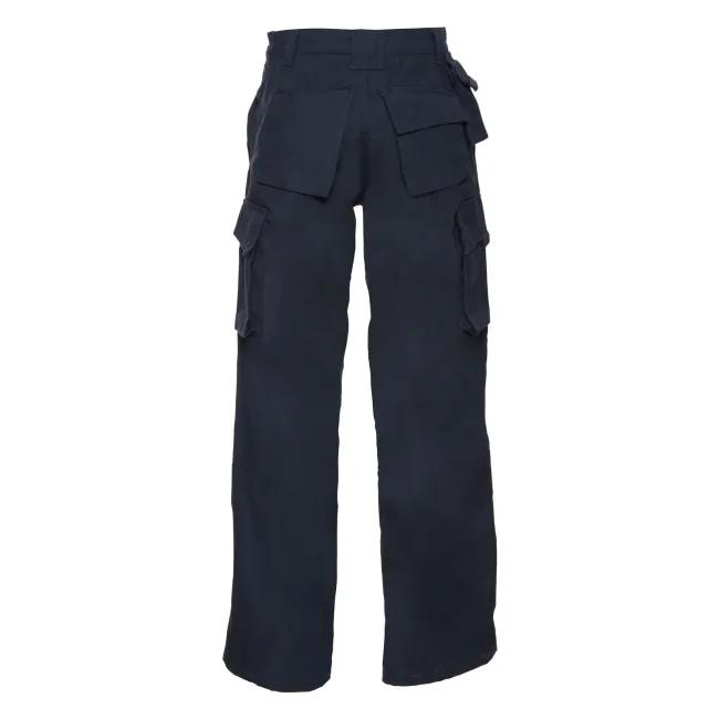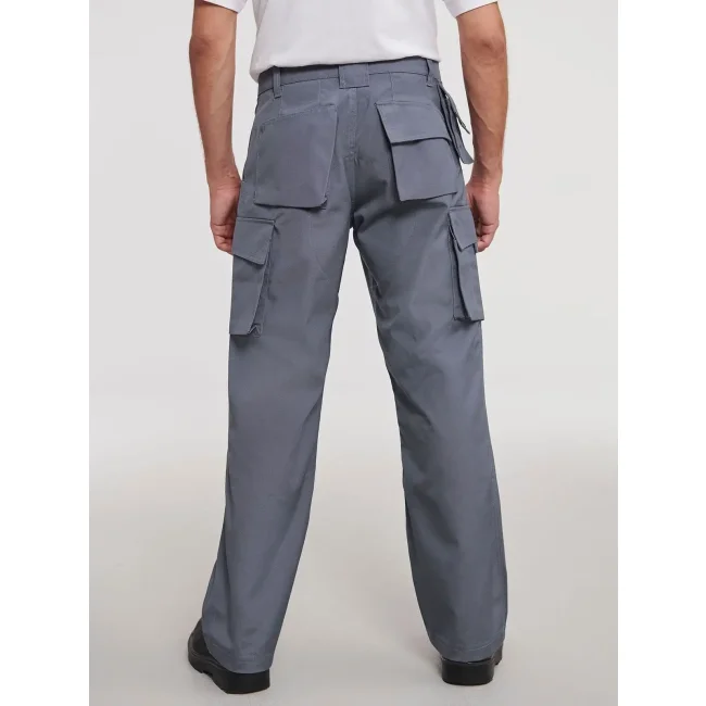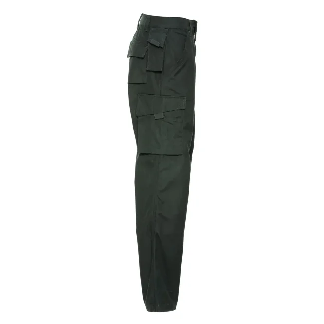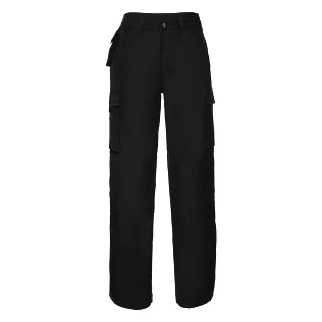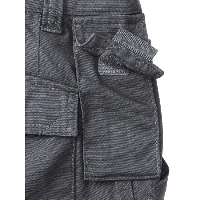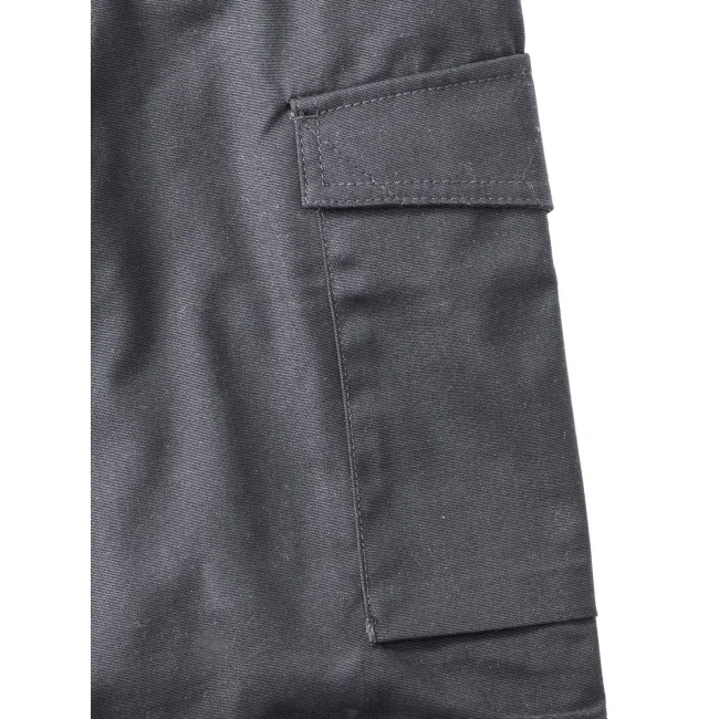 65% poliestere, 35% cotone. Pantaloni dal tessuto super resistente e antimacchia, conforme a ISO EN 26330/105C06/19945, marchio CE. Interno gamba e tasche anteriori con tripla impuntura, due tasche posteriori (1 con chiusura in velcro), tasca per cellulare, tasche interne per ginocchiera.