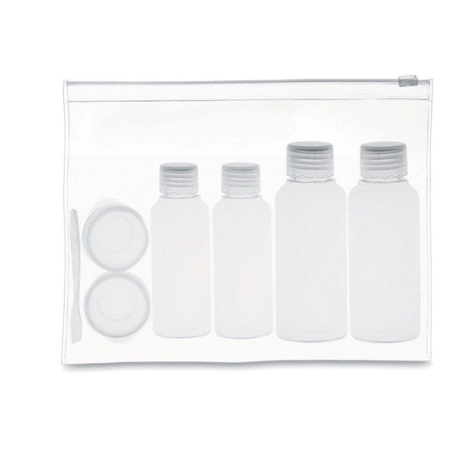 Set viaggio 4 flaconi e 2 porta lenti a contatto in plastica in busta trasparente richiudibile. (100ml, 50ml and 10ml).
