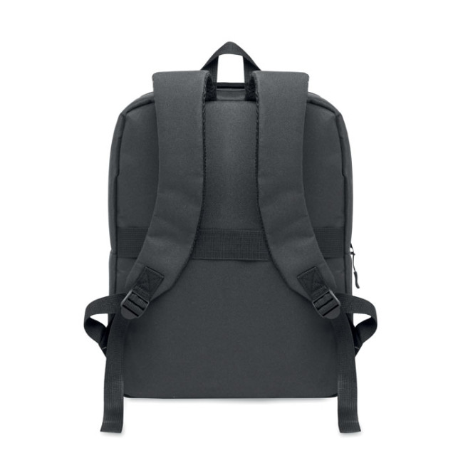 Zaino sottile per laptop da 15'' in poliestere 6300D RPET e fodera 210D. Scomparto imbottito. Tasca esterna con cerniera per tablet da 10'' e frontale con cerniera. Varie tasche interne. Schienale e spallacci imbottiti. Custodia per valigia.