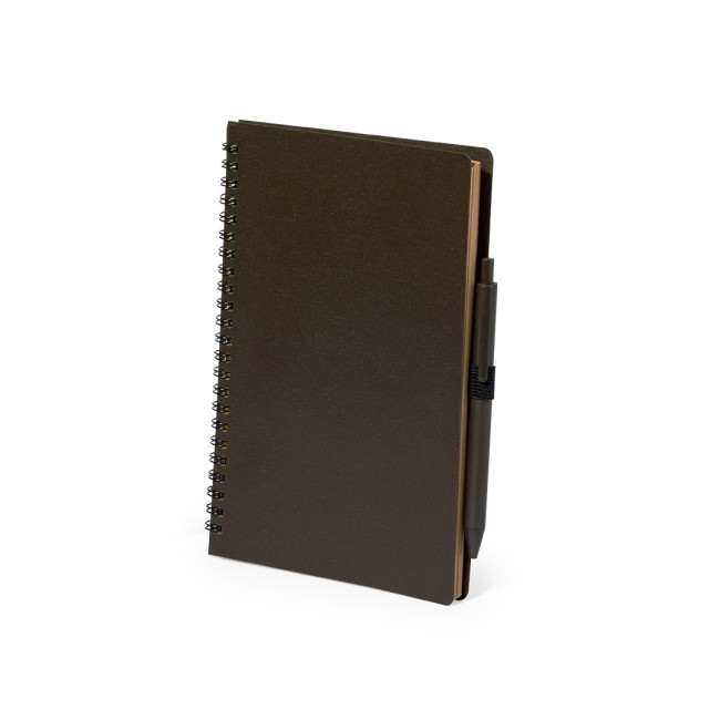 "Set composto da taccuino e penna. Taccuino ad anelli con copertina in morbida fibra di caffè e portapenne. Con 80 fogli dal design ecologico e dal layout a righe singole. Penna con meccanismo a pulsante con fusto in fibra di caffè e inchiostro blu. Include badge fibra di caffè stampato sul blocco e penna. Presentato in busta individuale riciclata.La fibra di caffè è ricavata dagli scarti della produzione del caffè. Un'alternativa sostenibile che contribuisce a ridurre l'uso della plastica, risparmiando energia nel processo di produzione e promuovendo così la tutela dell'ambiente".