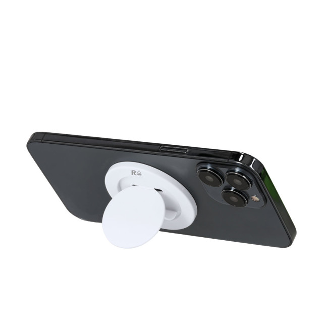 Supporto magnetico per smartphone in ABS riciclato con design compatto e pieghevole. Funzione doppia: supporto retrattile per poggiare il telefono e fissaggio sicuro.