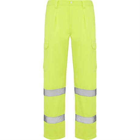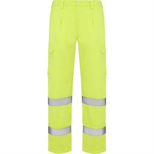 Pantaloni ad alta visibilità giallo fluor. · Fascia elastica regolabile in vita sul retro.· Due tasche anteriori. · Due tasche posteriori con patta e chiusura in velcro. · Due tasche laterali con soffietto e patta con chiusura in velcro. · Due nastri riflettenti orizzontali.