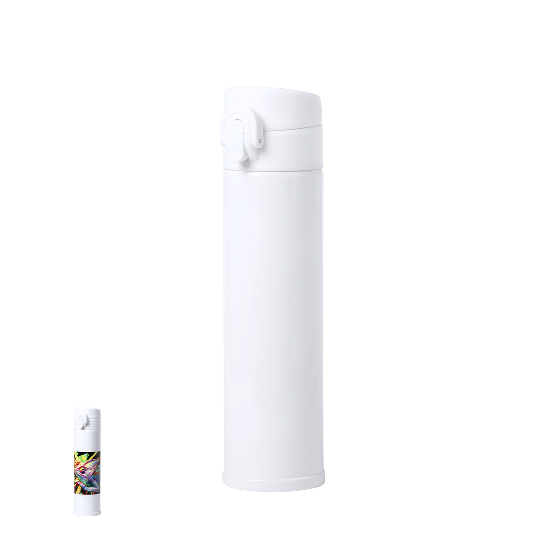 Thermos in acciaio inossidabile con capacità di 330 ml. Con doppia copertura per una migliore e più duratura conservazione della temperatura, con un blocco di sicurezza e un facile sistema di apertura con un pulsante. Realizzato appositamente per la stampa a sublimazione e presentato in un'attraente scatola di design,Manuale di istruzioni disponibile in spagnolo e inglese.