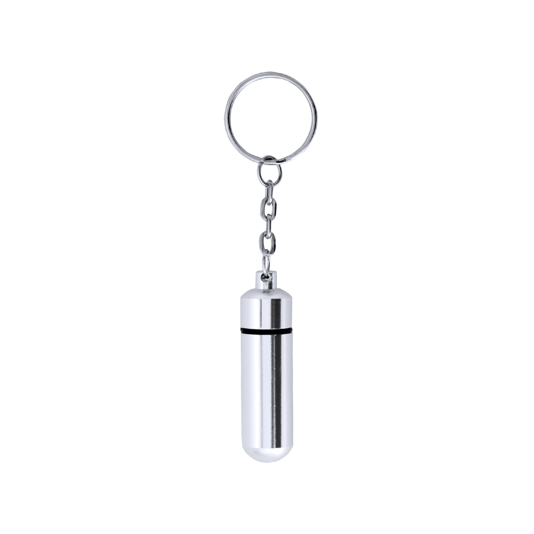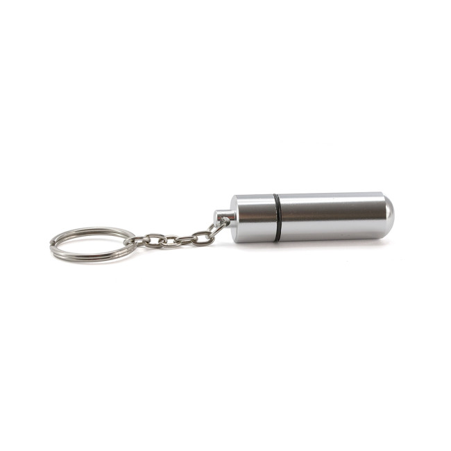 Portachiavi portapillole dal design discreto con corpo in alluminio lucido e chiusura a vite.