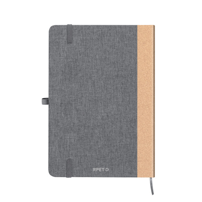 Block notes con copertina rigida in RPET e dorso in sughero. Include interni con 80 pagine lisce, segnalibro, chiusura elastica e portapenne abbinato. Logo RPET sul retro della copertina e disponibile in colori eleganti. Presentato in un sacchetto individuale di carta riciclata.Il materiale RPET è realizzato con plastica riciclata per incoraggiare il riutilizzo dei rifiuti plastici e contribuire alla sostenibilità del pianeta.