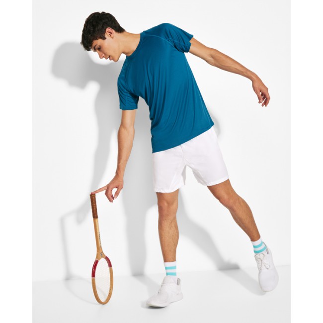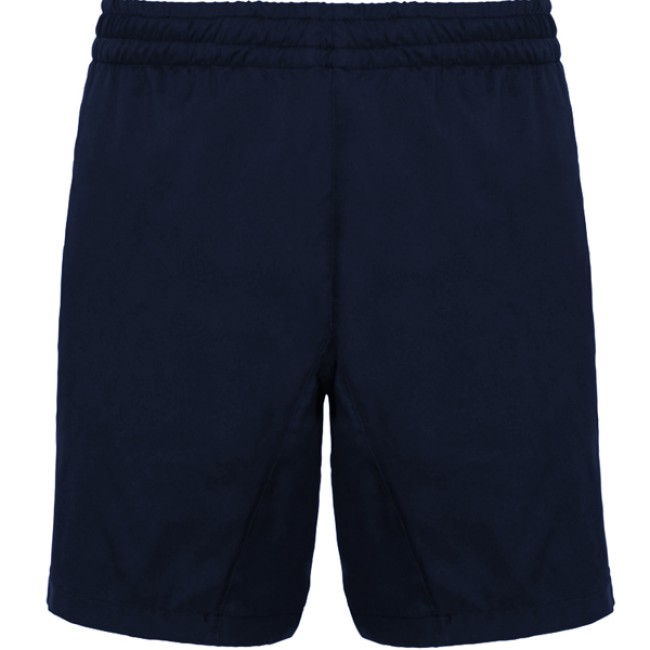 Pantaloncini sportivi con tasche laterali. Girovita elastico con cordoncino per regolazione. Tessuto leggero e traspirante con interno in maglia di microfibra.