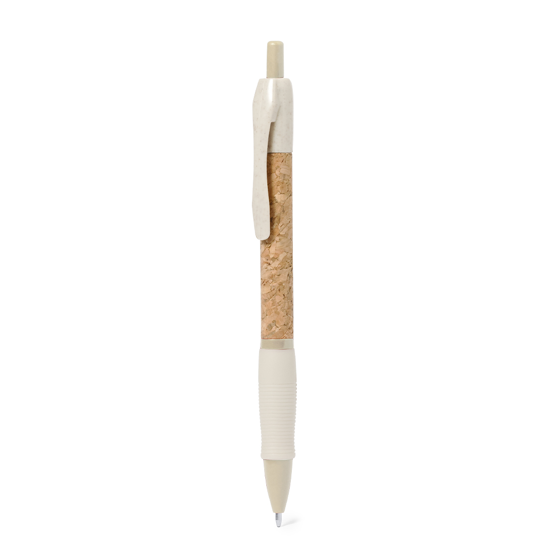 Penna con meccanismo a pulsante e fusto in sughero naturale. Clip, punta e pulsante in fibra di grano. Disponibile in una gamma di colori. Distintivo Wheat Straw sulla parte superiore della penna. In inchiostro blu.Realizzata con elementi di origine vegetale, promuovendo così l'uso di materie prime naturali e riducendo le emissioni inquinanti."