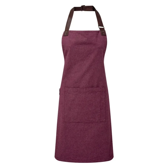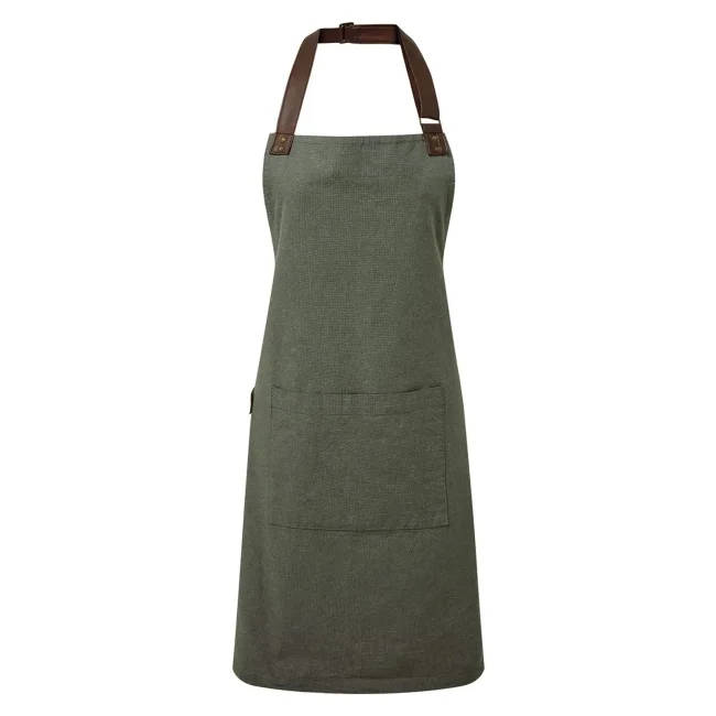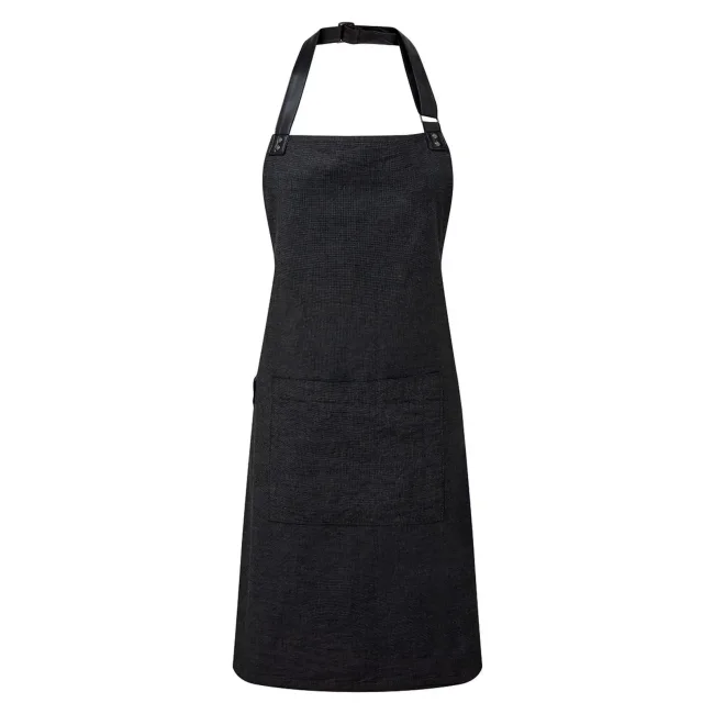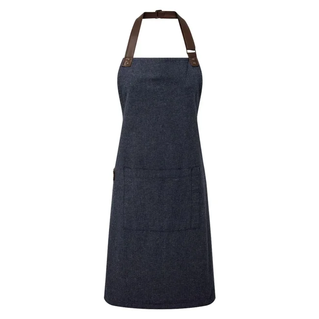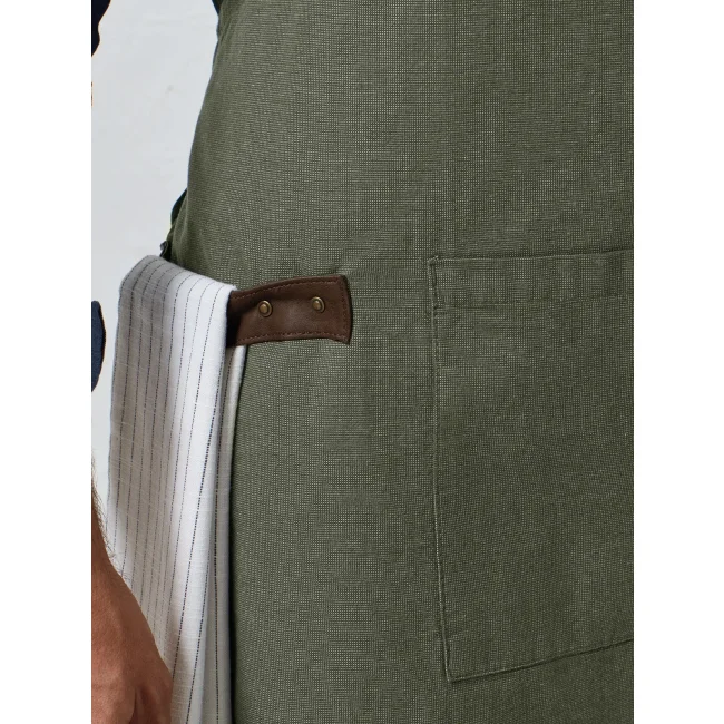 100% cotone Oxford effetto filato. Grembiule con inserti in finta pelle. Girocollo in ecopelle con fibbia regolabile e cuciture a contrasto, asola appendi-grembiule e linguette laterali in ecopelle con cuciture a contrasto, tasca centrale, doppio occhiello per la chiusura in vita.