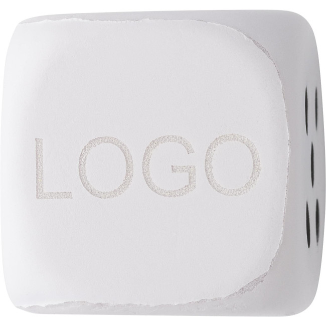 Antistress a forma dado, personalizzabile su di un lato, in PU. Gli articoli antistress possono essere stampati solo nei colori nero, bianco, oro o argento.
