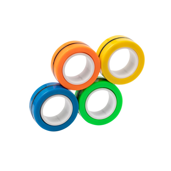 Antistress originale a forma di anello, composto da quattro pezzi colorati con calamite. Questi pezzi possono essere uniti e separati a piacere, sciogliendo la tensione grazie al loro movimento circolare. Possono anche essere utilizzati come trottole, presentati singolarmente in un sacchetto di RPET riciclato, contribuendo alla sostenibilità ambientale.