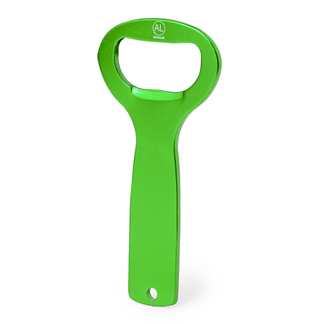 Apribottiglie in alluminio con manico fustellato e design vivace