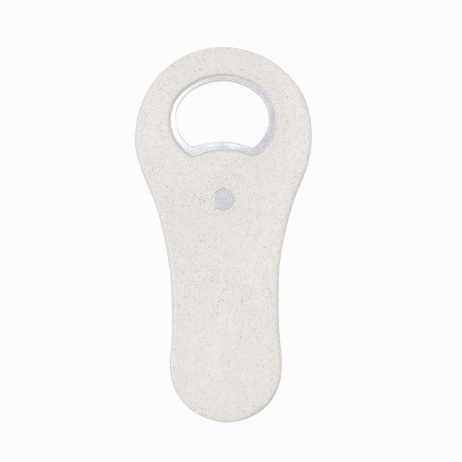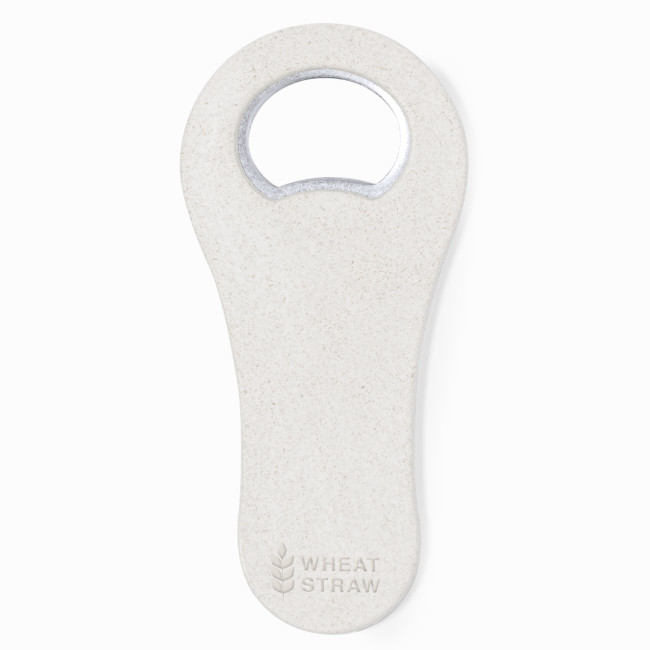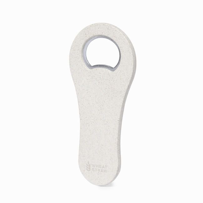 Apribottiglie realizzato in fibra di grano, dotato di una calamita per attaccarlo a superfici metalliche. Presentato in un sacchetto di carta riciclata, promuove l'uso di materie prime naturali e riduce le emissioni inquinanti.