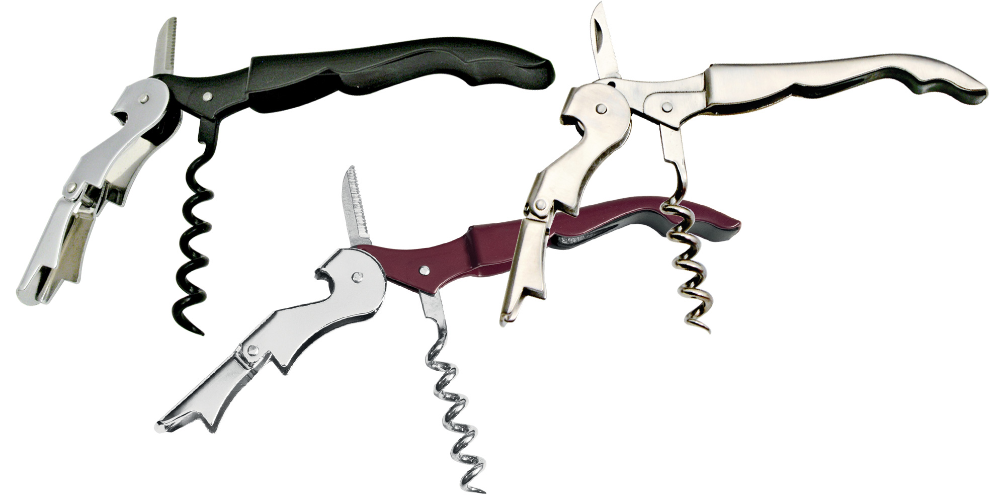 Apribottiglie multifunzione in acciaio inox progettato per semplificare l'apertura di bottiglie. Include un coltellino tagliafilo con seghetta e un cavatappi, rendendolo un accessorio pratico e versatile. Questo strumento è personalizzabile con logo, ideale per eventi e regali aziendali.