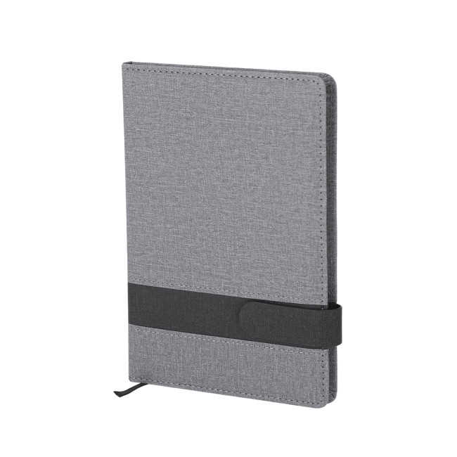 Taccuino A5 realizzato in pelle PU. Design elegante grigio con banda di chiusura magnetica nera. Interno con 80 fogli color crema, con layout a righe singole e segnalibro coordinato in tessuto.