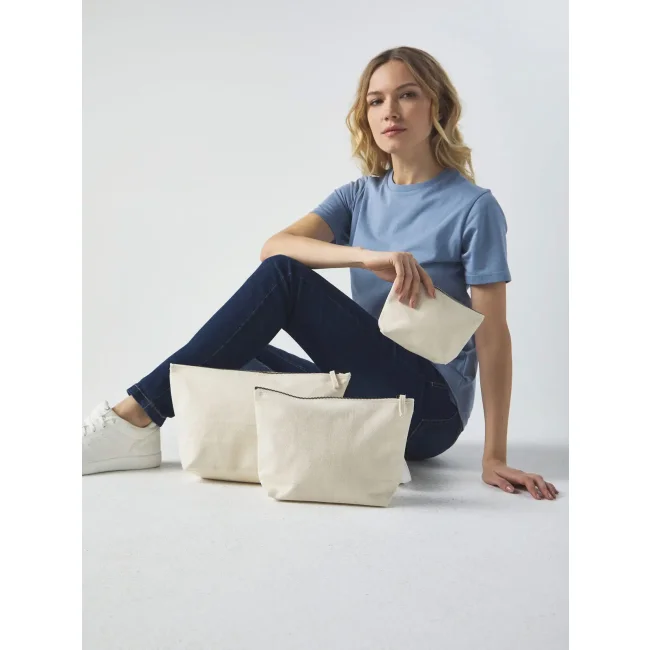 100% cotone organico. Mini pochette con zip in metallo anticato per un effetto vintage. Etichetta strappabile. Dimensioni: S: 19x12,5 base 6x13cm - M: 28,5x18 base 9x19cm - L: 34x21 base 11x23cm.