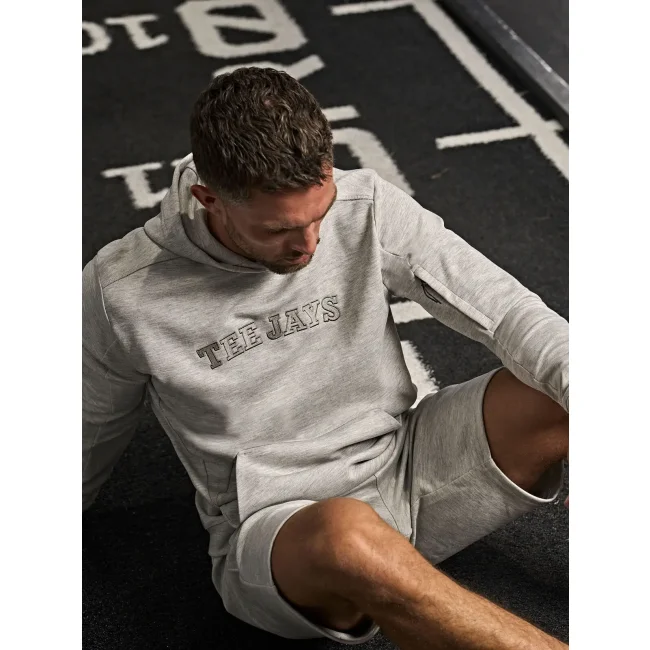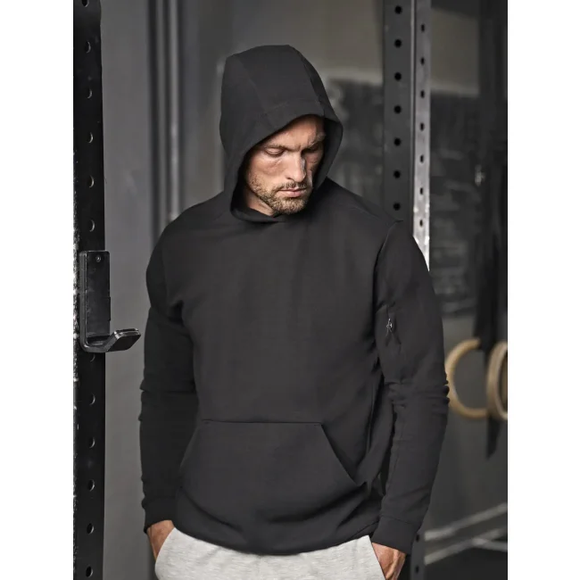 60% cotone 40% poliestere. Felpa in interlock con cappuccio a due strati, tasca frontale, tasca sulla manica con zip e cordoncino.