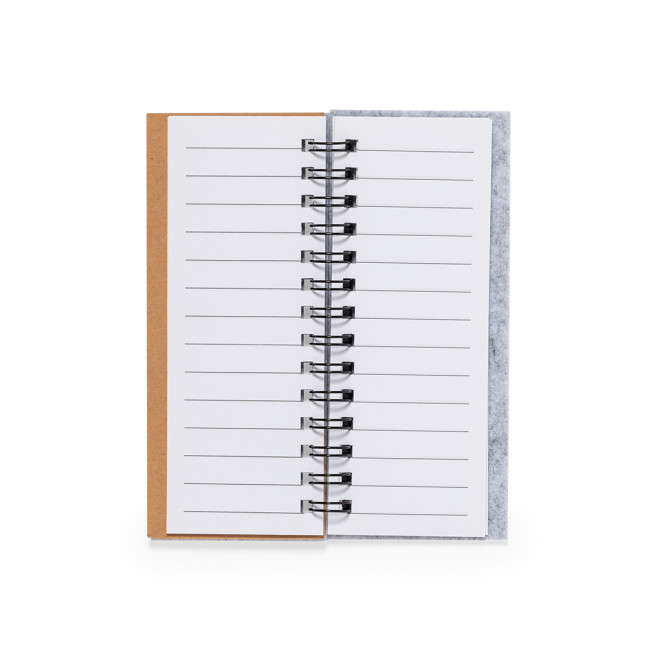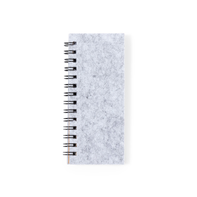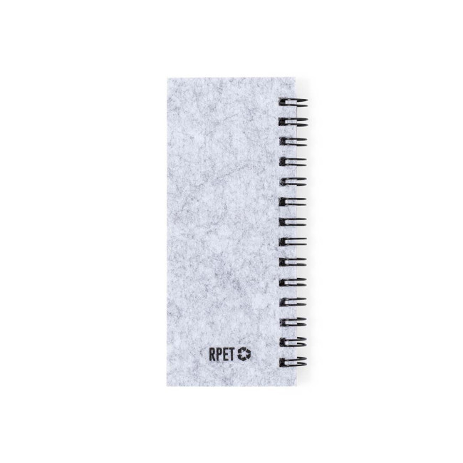 Block notes in morbido feltro RPET. Con logo RPET sulla copertina. Include:Raccoglitore ad anelli da 30 fogli bianchi con layout a righe e etichetta riciclato su entrambi i lati.25 note adesive medie.125 mini note adesive in vari colori.Presentato in un sacchetto individuale riciclato.