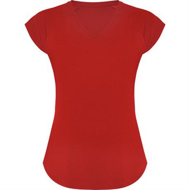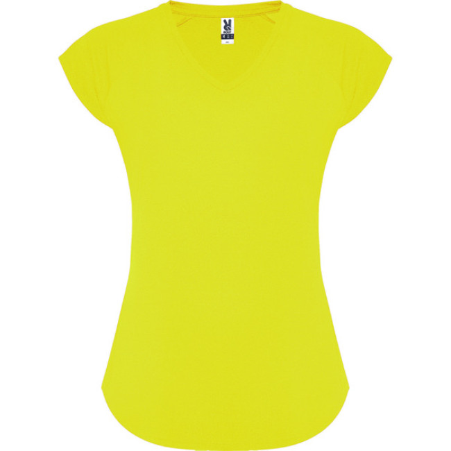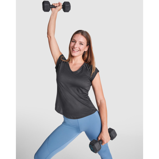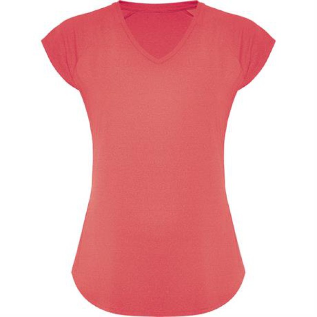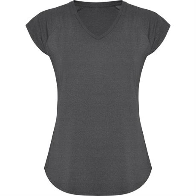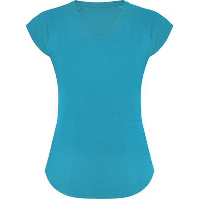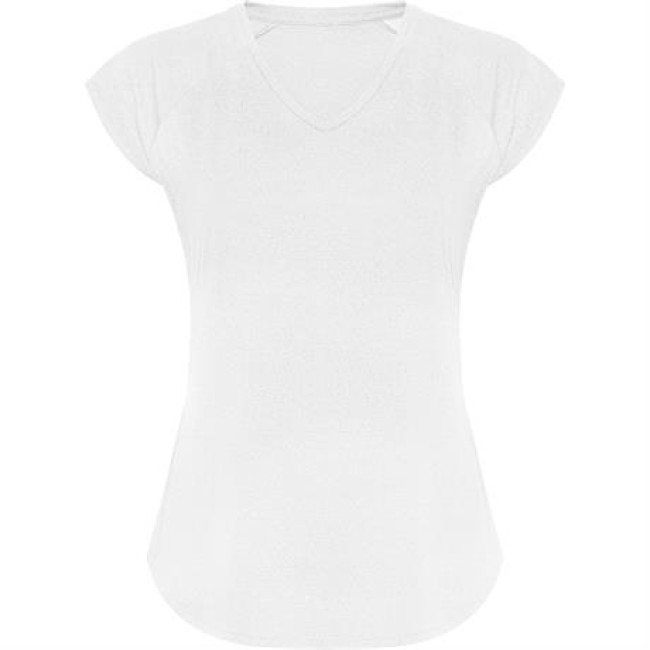 T-shirt tecnica multisport da donna maniche corte stile raglan. Collo a V. Tessuto poliestere tatto cotone. Taglio aderente.