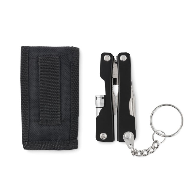 Coltello multiutensile pieghevole con torcia in acciaio inox. Include 10 funzioni di utensili e una custodia in poliestere 600D. Comprese 3 pile a bottone AG3.
