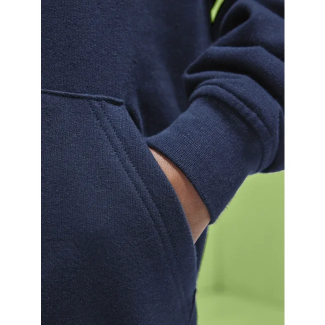 Felpa con cappuccio B&C ID.333 per bambini, realizzata in cotone e poliestere riciclato. Dotata di spalla scesa per una maggiore libertà di movimento, cappuccio foderato in jersey e tasca a canguro. Polsini classici e orlo inferiore in costina con elastan per una vestibilità comoda.