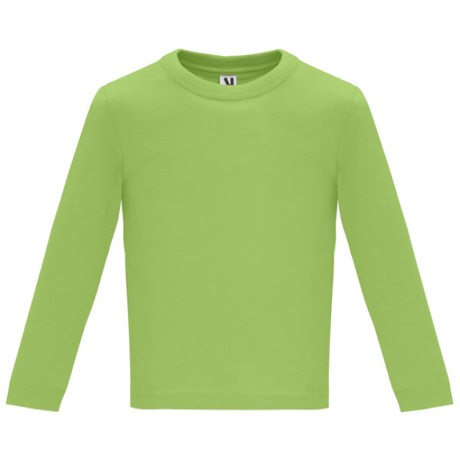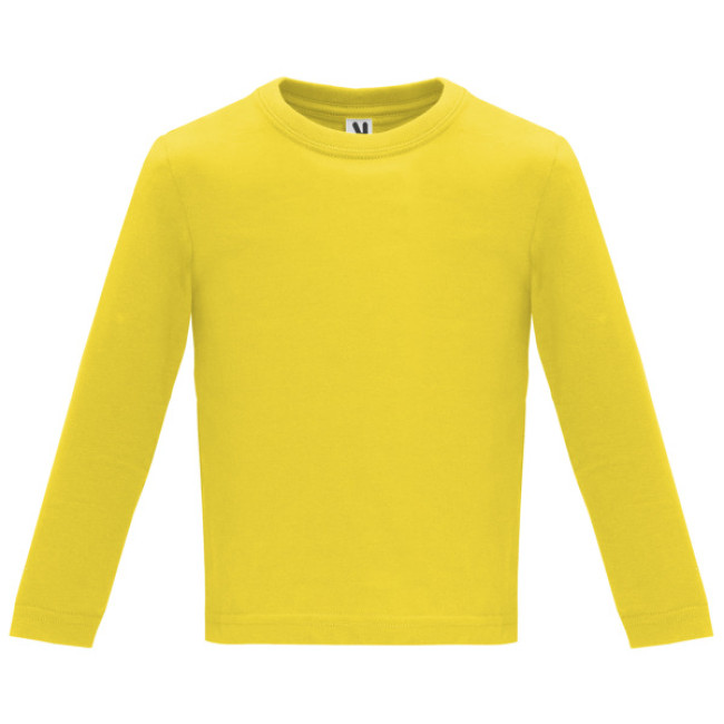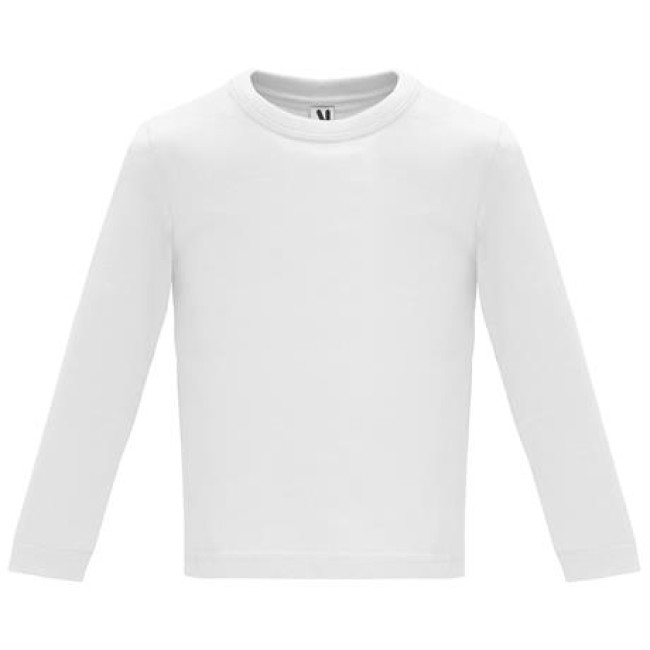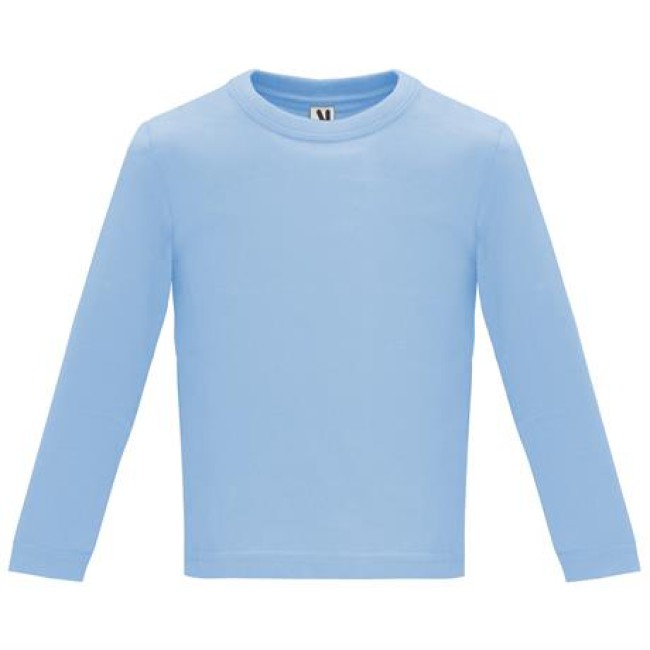 T-shirt- manica lunga, confezionata a maglie fini e compatte. Girocollo e apertura sulla spalla con bottoncini metallici dalla taglia 6m alla 18m. Taglia 2A senza apertura sulla spalla. Cuciture laterali.