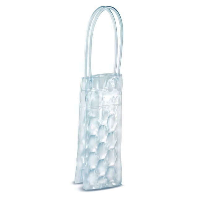 Borsa termica con manici per una bottiglia (non inclusa) in PVC trasparente con intercapedini a nido d'ape pieni di liquido refrigerante. Da tenere in freezer per raffreddare il liquido interno.