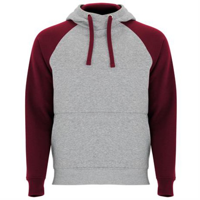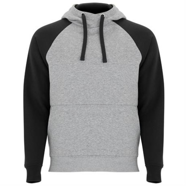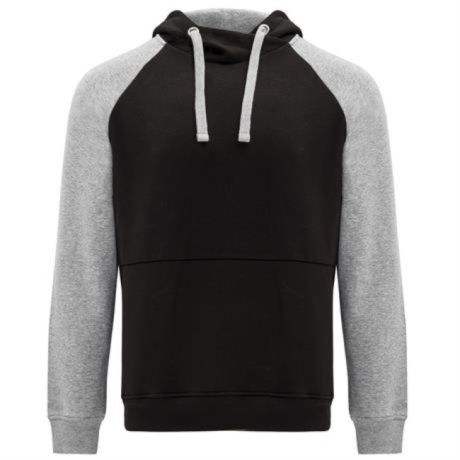 Felpa bicolore unisex. Cappuccio con coletto incrociato e occhielli metallici, interno e cordoncini a contrasto. Manica raglan a contrasto. Tasca a canguro. Polsini e girovita in costina 1x1 con elstan.