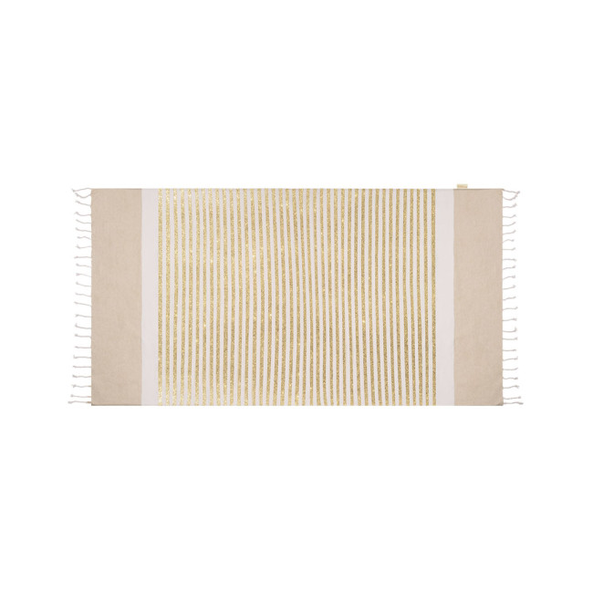 Pareo Asciugamano in cotone riciclato di 180g/m2. Design a righe bianche in combinazione con righe dorate effetto glitter estremità in beige liscio e distintivi frange agli estremi a forma di corda. Include etichetta con distintivo cotone riciclato.