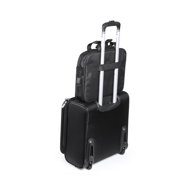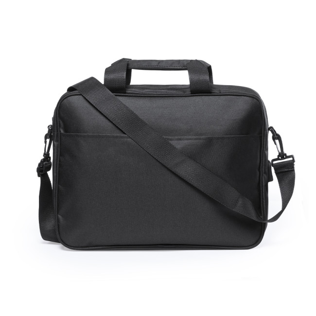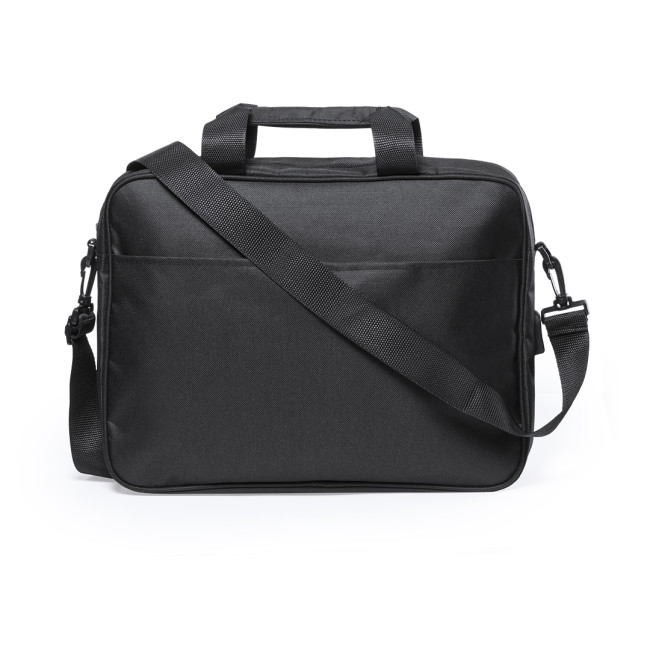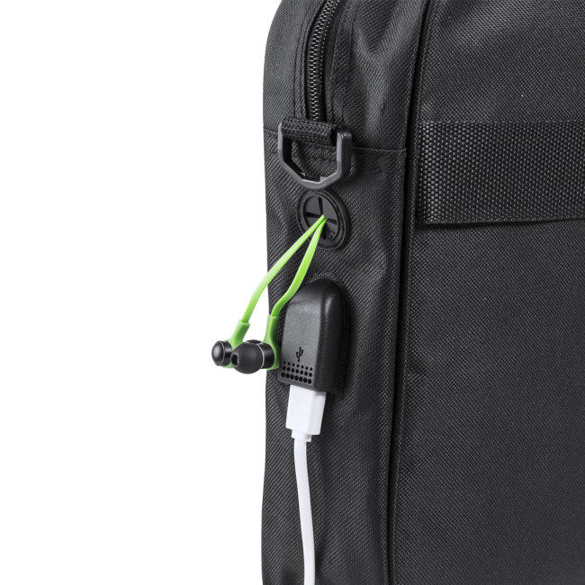 Portadocumenti in resistente poliestere 600D con finitura nera e chiusura a zip. Con uscita per le cuffie e scomparto interno con uscita USB per il collegamento al powerbank - non incluso -. Con robusti manici rinforzati e accessorio sul retro per il fissaggio del trolley. Interno con scomparto imbottito per laptop fino a 15" e scomparto per tablet fino a 10". Con numerose tasche interne ed esterne e tracolla regolabile con chiusura a moschettone.
