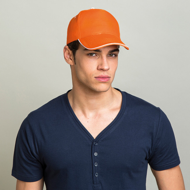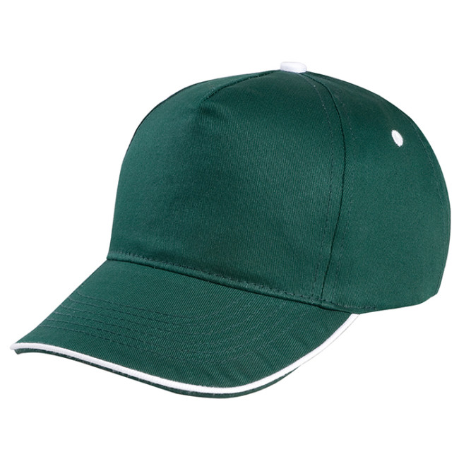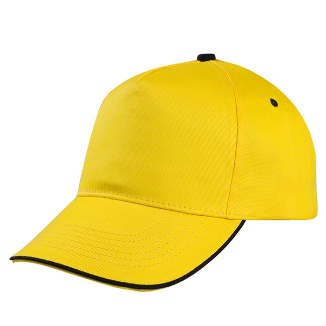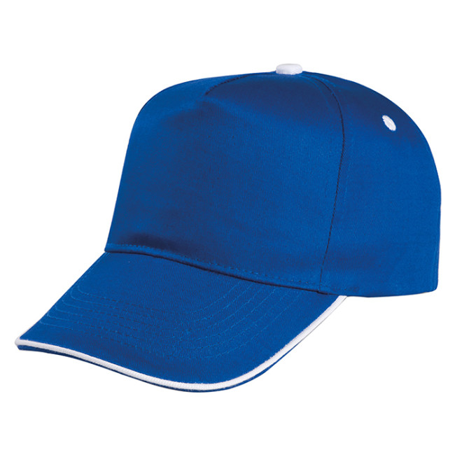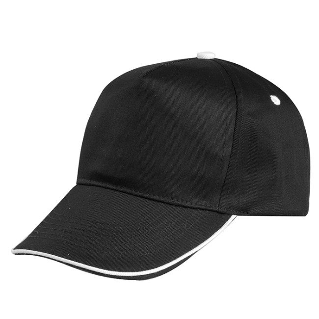 cappello 5 pannelli cotone twill 108/58 fascia tergisudore in colore abbinato occhielli ricamati frontalino rinforzato visiera rigida sagomata con piping a contrasto chiusura in velcro regolabile in colore abbinato colori reattivi colori piping: BI-GI piping blu navy AR-BL-NE-VS-RO-RY piping bianco