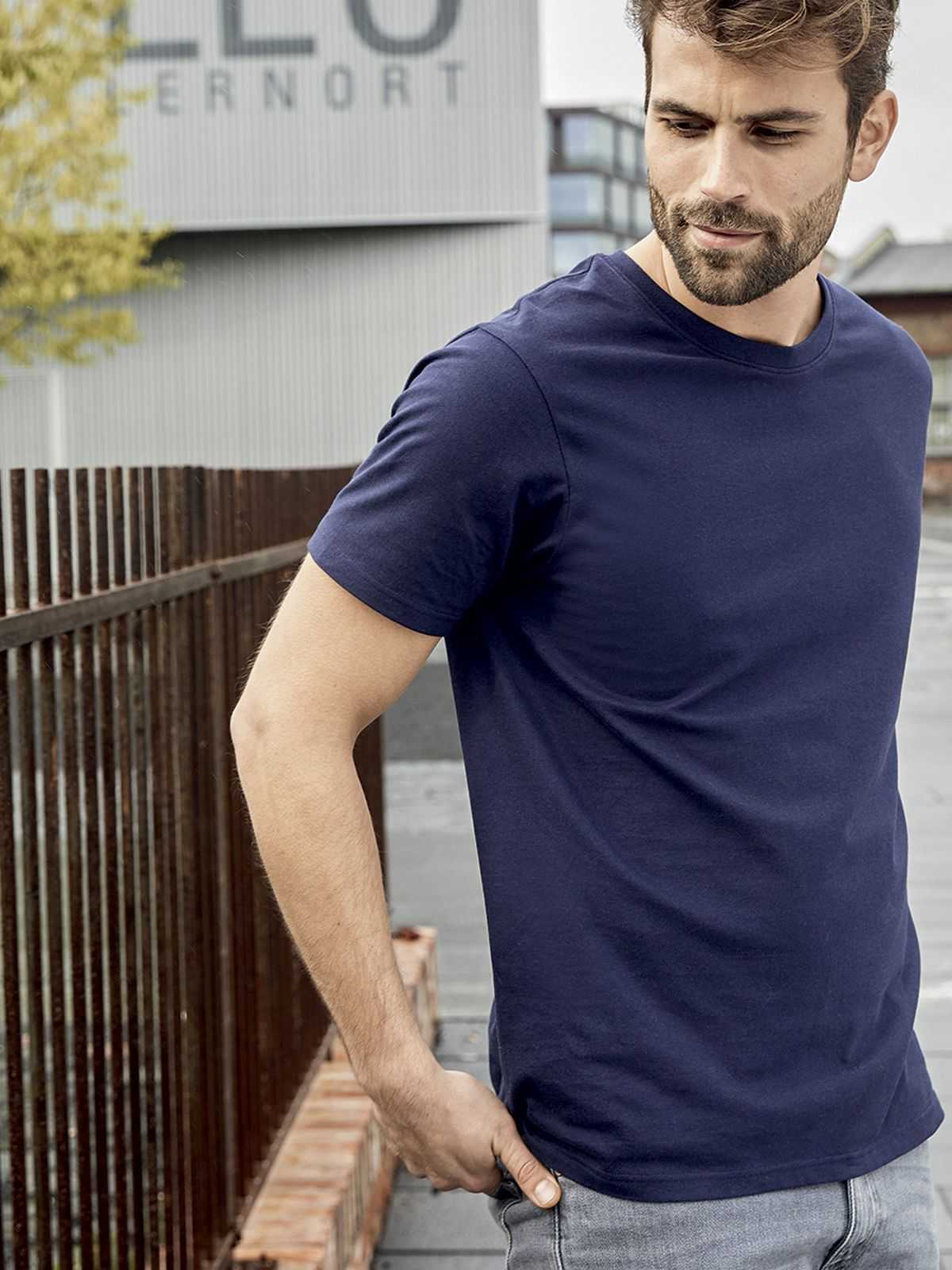 100% cotone. single jersey. T-shirt girocollo da uomo, bande nelle maniche in elastane, etichetta strappabile. Busto tubolare. Grey-Heather 85%C, 15%E