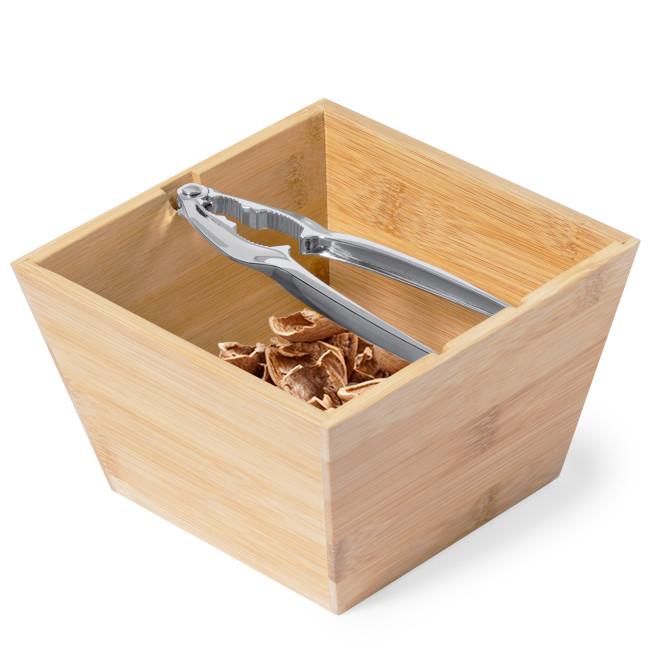 Pratico set di schiaccianoci. Contenuto: Ciotola in bambù naturale, con capacità di 1,4. Schiaccianoci in acciaio inossidabile, progettato ergonomicamente per rompere il guscio in modo rapido e semplice, mantenendo il frutto intatto. Confezionato singolarmente in una scatola kraft di design.