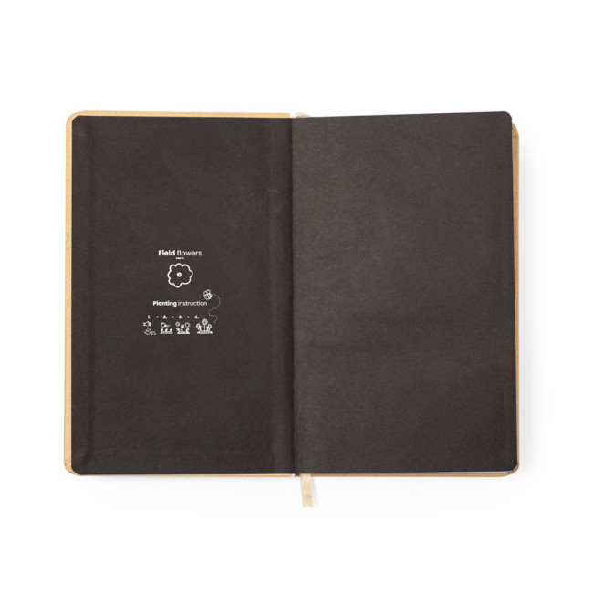 Block notes con semi in robusto cartone riciclato. Con copertina cartonata, segnalibro e 80 fogli interni con impaginazione a righe singole su carta riciclata. Inoltre, la copertina contiene una capsula con semi di fiori selvatici, in colori assortiti e con istruzioni per la semina sul retro della copertina.Il cartone riciclato proviene dal riutilizzo di eccedenze di produzione e dal riciclo della carta a fine vita, rendendolo una tela ecologica e sostenibile.