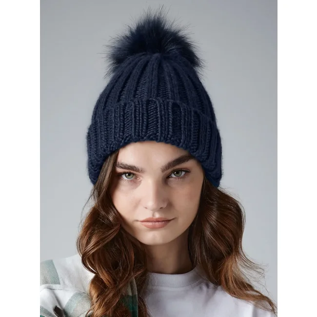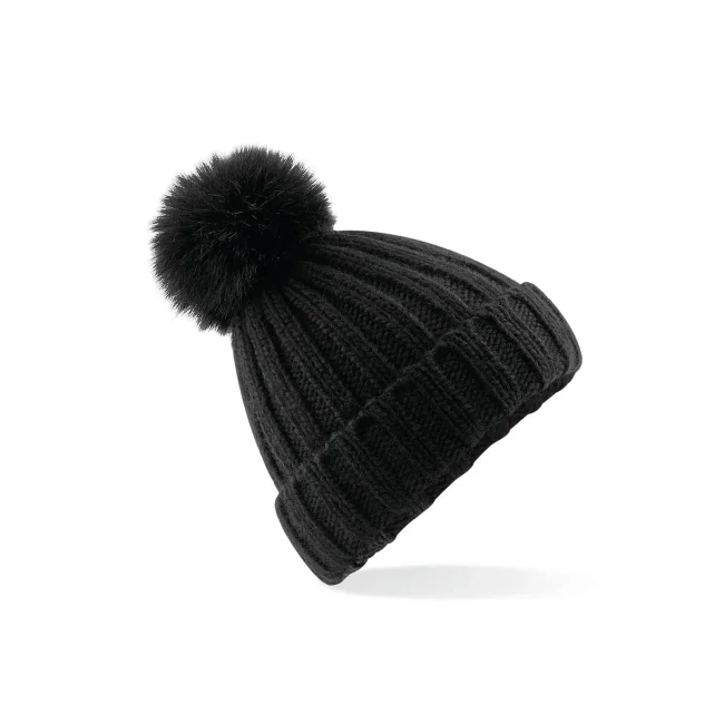Cuffia unisex in acrilico soft-spun al 100%, caratterizzata da un elegante pompon di pelliccia sintetica rimovibile. Il design a risvolto e la maglia a coste in filato pesante offrono comfort e stile, con un peso di 115 g.
