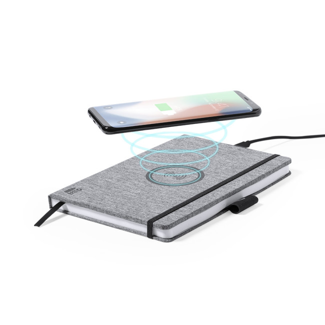 Block note della linea natura - formato A5 - in resistente poliestere 300D RPET realizzato in plastica riciclata per incoraggiare il riutilizzo dei rifiuti plastici e aiutare la sostenibilità del pianeta. Con caricatore wireless 10W integrato nella cover. Include 80 fogli a righe. Compatibile con smartphone dotati di tecnologia di ricarica wireless. Include un cavo di ricarica di tipo C e un manuale di istruzioni in inglese e spagnolo.