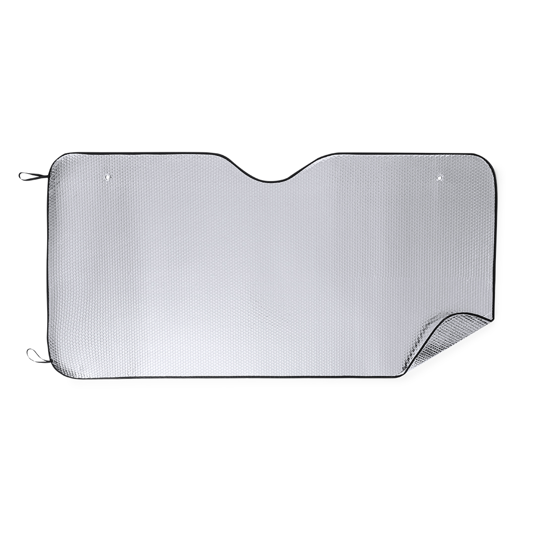 Parasole in alluminio con bolle su entrambi i lati in colore argento con finitura metallizzata e finiture nere. Formato maxi 180x90cm, con anelli di rinforzo in metallo, elastici per la piegatura, due ventose per il corretto posizionamento nel lunotto e inviato steso.