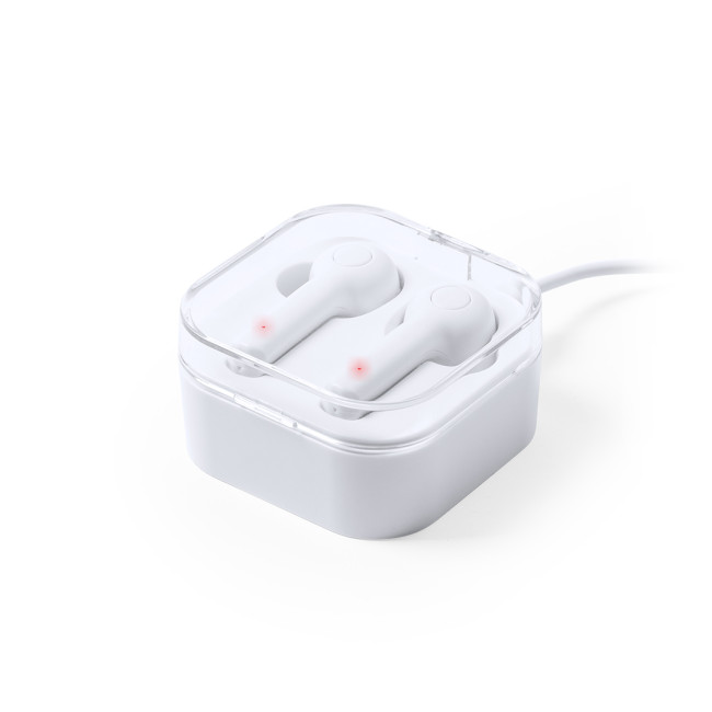 Auricolari Bluetooth® 5.0 con supporto di ricarica wireless 5w, compatibile con i dispositivi dotati di tecnologia di ricarica wireless In elegante finitura bianca e design ergonomico. Dotati di un pulsante di controllo integrato nell'auricolare e di una batteria al litio. Base di ricarica di colore abbinato e spia di stato di ricarica a LED. Funzione vivavoce e ricaricabile, con cavo di ricarica incluso. Confezionate singolarmente in un astuccio deluxe con coperchio incernierato e in un'attraente scatola di design
